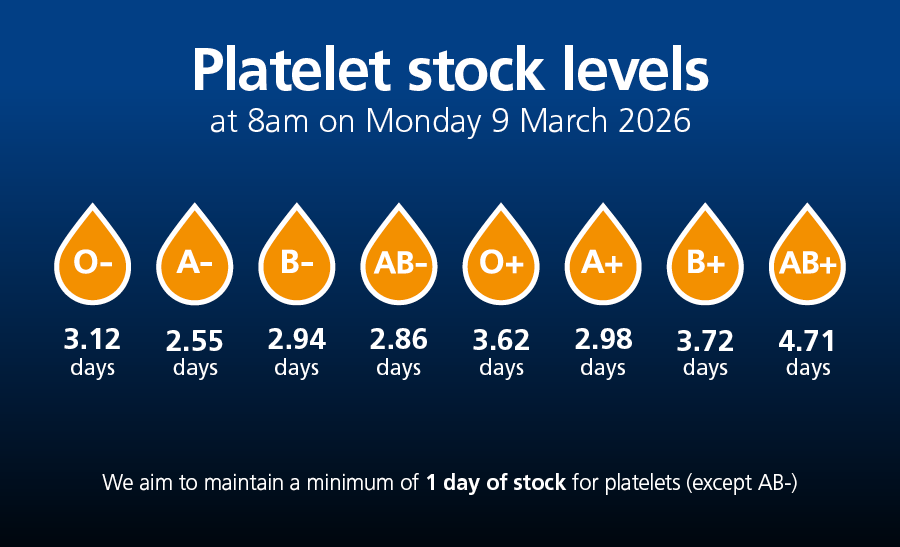 When stocks are low we may need to offer substitutions. Information on substitutions and transfusing across blood groups is available in the guidance section of the platelet toolkit.